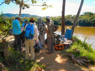 blog-Aug-3-2013-4-rigging-for-golden-doradoWe left on time and after our sloppy four wheeling through the mud to where the boats pick us up to take us to the plane we found ourselves standing on the banks of the Secure River.  Our boat wasn’t there yet so naturally as a group of anglers we stared at the water.  Man, I wanted just one more day.  Maurisio suggested I set up a rod.  My tackle was truly buried so Dale offered his.  The gang coaxed me on and next thing you know I was rigged and tromping down a rugged jungle wood strewn hill for the river in my flip flops.