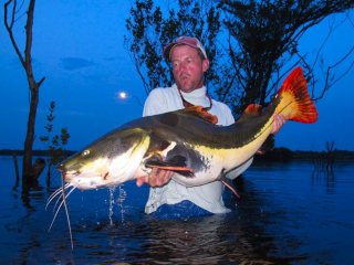 Mark clicked off pictures at about every angle possible. I did some sitting down with the fish then I stood up in the bow and strained every muscle in my body to hold him. Finally we took the fish to the shallows and I got out and played with him there. The redtail catfish is a truly amazing creature.