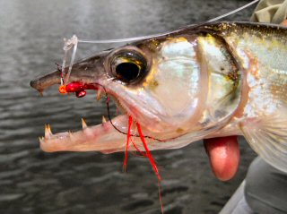 There was a lot of activity splashing around mid lagoon. There’s lots of baitfish species that don’t take flies. The guides have various names for them. I often launch a cast at their splashes in hopes something weird takes my fly. Today I landed a picúa, often known as the freshwater barracuda or dogfish. They put up a good little fight but if you don’t have on wire or heavy mono shock tippet you’re likely to lose them because of their teeth. When I caught this one Moe kind of gave me a look of disgust as he really wants some big peacocks in his boat rather than what he considers garbage fish.