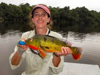 Fishing remained hot. Becky racked up more fish than she’d taken in a single day all trip. I too had numerous peacocks. We caught all species of them including this gorgeous little butterfly. On low water years we catch more butterflies than you can imagine but this was the only one Becky and I saw all week. I also got a cast at a pirarucú also known as arapaima. These fish are rare in the Amazon these days because they are delicious, air breathing and easy to harpoon. They reach sizes of over 10 feet long and more than 600lbs! One pirarucú can feed an entire village. The pirarucú I cast to was small, I’m guessing by his disturbance more like five feet long. I cast at him right after he rolled then several cast towards his bubble trail but then he was gone. You can only imagine how bad I want to catch one of these rare fish!