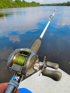 We thought the action would be good after that, but we never got another bite there or at any other places. At 4:30 we made one last attempt. It was another high bank. The sun was setting. There were some very unusual bird sounds all around us, howler monkeys growling as if in a rage and the constant breaths of the freshwater dolphins up and down the river. It was very special and Mark and I were both reminiscing about the week. It’s been a great one. Then I got that thump again. Only it thumped then nibbled. Then thumped then nibbled. I let out some line and watched it go. Something decent definitely indulged on my piranha head. I lowered the bait casting outfit and reeled till I felt pressure than set the hook like no tomorrow. Fish on!