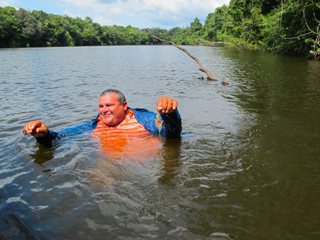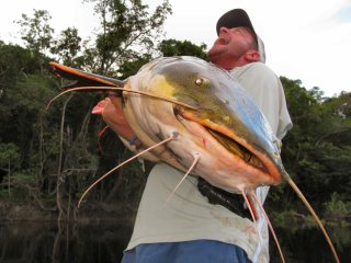 Mark clicked off pictures at about every angle possible. I did some sitting down with the fish then I stood up in the bow and strained every muscle in my body to hold him. Finally we took the fish to the shallows and I got out and played with him there. The redtail catfish is a truly amazing creature.