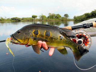 Moe told us we had to leave at 1:30 in order to be back to camp by 2. When he grunted and held is hand up with four fingers we knew we had four minutes left. We’d had a terrific morning of fishing but Becky was still shy her 10lber. There was a great looking sunken tree approaching. I reeled in and said its all yours and watched. Lo and behold, she made one strip and the three of us watched a massive peacock devour her fly. I mean 15lbs or better! It was flipping humongous! And you know what happened? It wouldn’t have mattered who was holding the rod. The rod could have been a 12-weight, a tuna stick or a marlin rig – Becky was toasted!