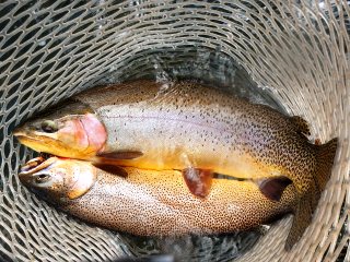 The biggest fish was this brown trout. Pictures never do a fish justice but trust me, this was a beaut. Other fish worth mentioning were two slab cuttbows that were so fat they looked to be about 18” but the truth is they were more like 20”. You can see one in the photo of the next paragraph. The smaller fish is a nice cutthroat but he doesn’t look so great next to the beast.