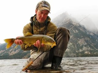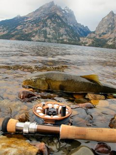 Landing the lake trout I got up early for on my 5-weight probably wasn’t going to happen so after my fun of catching a few I went back to my 7 and continued dredging. Absolutely not a strike. At 10 I was thinking of packing it in because I have plenty of work to do at home but the wind intensified and I could see a storm brewing and blocking out the Tetons. I hoped it would be the storm that triggered the big fish bite. I casted aggressively through the entire hour long lasting squall but still not a bump. By 11 the storm was gone and Jenny slowly calmed down from whitecaps to a gentle waves. That’s when I hooked up to something stronger than a cookie cutter mackinaw. My heart jumped a few beats but I could feel awkwardness. I had a sizeable fish but it wasn’t making the typical big lake trout run. After a minute of stubborn fighting, up to the surface came a glowing sucker. A sucker! While most anglers would have been disappointed, I was stoked. I balanced my camera on a rock and got me a sucker hero shot. Good fun!