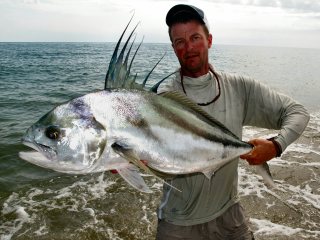 I ended the session on our first beach by casting to a disturbance on the edge of a mud line created from waves breaking on the beach.  I expected another ladyfish.  Luckily I was back to using my 10-weight because first strip through that mud and up came the cone of a 25lb plus roosterfish.  My heart jumped a beat and I hit the deck and picked up the speed of my fly.  Wham!  I had him and fifteen minutes later I landed this awesome fish.  Glad we got him – that was about it for our day.