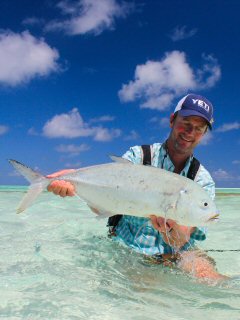 I struck this fish so hard he nearly jumped. When he thrashed on the surface I saw yellow in the tail but the tail shape was too small. After a hellacious battle on the 9-weight I landed a hefty brassy trevally. Not exactly what I was dreaming but anytime you catch a fish like this will put a smile on your face.