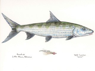One of the commissions I completed this week was a 9” x 12” bonefish (Albula vulpes) watercolor painting for Dan Beistel of Florida. This was one of many gorgeous bones Dan recently caught at Little Abaco in the Bahamas. I even remarqued his painting with the fly he caught him on, a pink puff. If you’ve ever wanted to preserve a memory of a fish you caught feel free to contact me while it’s Almost too cold to fish!