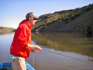 The 4th annual “Bass on the Fly” tournament took place today at Ririe Reservoir in Ririe, Idaho. There were 14 teams and we left the docks promptly at 8 AM. My team consisted of my usual teammates, Weldon Jones and my wife Granny. Weldon and I did most of the fishing while Granny rowed us around the rocks.It’s been raining for a week and the lake was slightly off color. While some anglers were