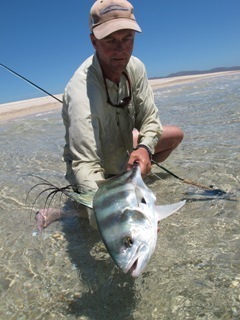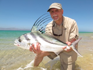My rooster of today actually appeared while I was stripping back a cast I made to a reasonably size houndfish (giant needlefish). The hound simply turned away and as I continued my strip trying to regain his interest a rooster showed up with his comb dorsal erected. I stopped my fly, stripped again and then he ate it in the pause. Then there was that look of surprise on the roosters face as the hook sank in (probably similar to the surprise on mine). He hesitated for two seconds then took for the seas and my Saltwater Sharkskin line left the reel in a trail of backing. Five minutes later I landed a respectable “first rooster of the trip”.