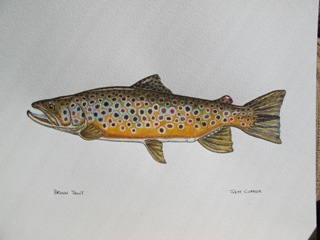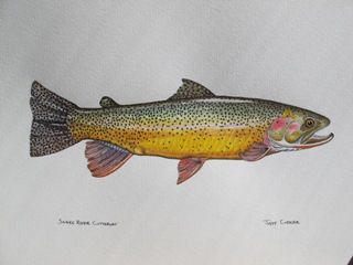 I got home Friday afternoon from the voiceovers and Ian of South Fork Lodge sent me an email that three of my paintings were sold out of the lodge gallery and he needed more. Heck, I’ve been irresponsibly fishing all over the last year. I don’t have back stock. Needless to say I have been painting constantly all weekend and completed two pieces, a brown and a Snake River cutthroat. However, only the cutty will head for the framer tomorrow. After about 12 hours of work, during the last seconds of completion I carelessly spattered the brown trout piece with micro dots of red ink. I am mortified. Pressed for time and 12 hours is lost! This is a 12” x 16” original watercolor that I sell unframed for $900!