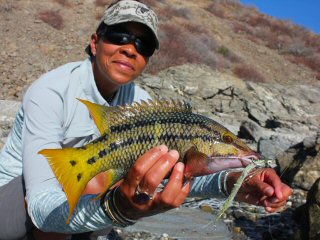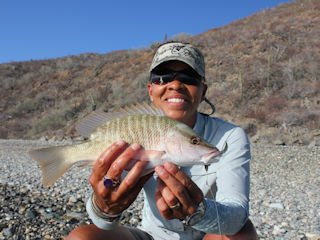 Though Gary is booked solid this week, he generously offered to drop Granny off on a remote beach for a passing roosterfish and catch some fun fish off the rocks. I staked out a position on the beach for the roosters while Granny took my 9-weight and went to town fishing a flashy Clouser Minnow around the rocks. Here are a few of the neat fish she managed to catch.