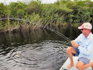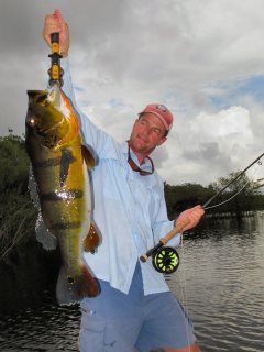 This appeared to be a great time for Becky to rest her arm so I went to work casting from the bow while Matu eased me along with an electric trolling motor. Even though I wasn’t catching any fish I was having a good time. One thing about peacock fishing is that the deeper into the jungle you land a cast the better you do. At this particular spot casting was like a game. I wasn’t even thinking about fish. I was just taking casting risks one after another lucking into a few casts that surprised the hell out of me. But it wasn’t some great cast twenty feet back through a small gap in the forest that drew the first strike. The brutal attack on my fly occurred about ten feet out towards the boat. And it’s a good thing.