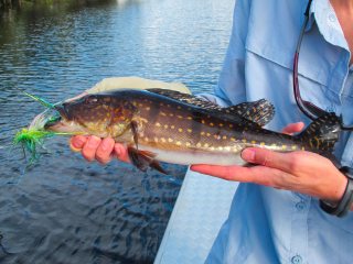 You could say that Becky was in a state of shock. She was very impressed with what turned out to be a 13lb peacock. But it was the power of the peacock that awed her most. She was flat out frightened. This fishes strike and run had me grunting and groaning, nearly yanked me off the bow and bent my rod deeper than you could do by hand before finally giving in. Becky gave me a nervous smile, shook her head and said had she not seen that fight with her own eyes she would never believe it. And she said she wouldn’t have had a chance.