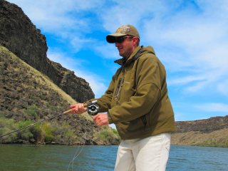 Andy’s success would explain why his boat is the nicest jet boat I’ve ever fished out of. This is a boat most hard core angler’s dream of owning. Erik and I met Andy at around 10 this morning on C. J. Strike Reservoir a few miles from Bruneau, Idaho. C. J. is a well known smallmouth bass and black crappie fishery, yet it’s about three weeks too early. Instead, for us today was mostly a boat ride and when we did fish, it was all about struggling with the wind. Not so much the fly casting, but rather handling a big boat to keep us where the fish might be.