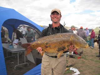 At the weigh in tonight it was evident that carp do not love the cold anymore than we humans. There were a total of four teams that registered some carp. Most teams caught only one while one miraculously found a hot spring of some sort and caught three. It was such a tough day that we are tied with 16 teams for last place with a BIG FAT ZERO! Even worse, we cooked and ate dinner in pouring rain and now I’m bundled up in my sleeping bag in the back of my truck listening to the rain outside. Monsoon Currier strikes again!