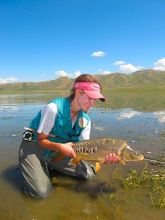the fly. Becky hooked up first. I had her to slowly strip a brown woolley bugger off a point where I saw several carp free-jump. Sure enough on about her 5th cast she had one. I already mentioned Becky can fly fish well and catch fish with the best of them, but she has little experience with big fish. When this carp took off I could see the fear in her eyes. But she handled it like a pro and in less than ten minutes she was hugging her first carp, about a 7lber with a more normal mirror carp scale pattern.