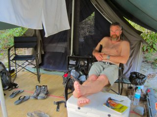 In addition to the tough fishing we took on too much hiking for such hot conditions.  I’ll bet it was a ten miler in and out of the water over rocks in wading shoes.  It was a grunt.  We returned to camp tonight exhausted and ended up sitting in the river for about an hour after dark just cooling off.