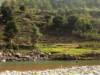 Our camp is no less than spectacular here on the banks of the Saryu River. This morning I fished right in front (look very carefully you’ll see me on bottom left and tops of our tents behind).  It’s a beautiful pool but in two hours I never touched a fish.