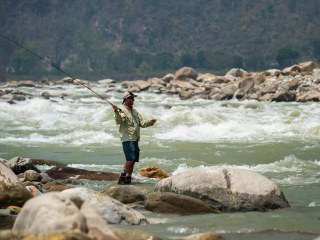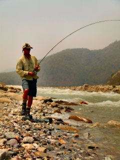 It was 110º and there wasn’t an ounce of wind. My hair may as well been on fire. I deliriously staggered to the rivers edge and started doing the motions. Chris followed with his camera and I’m guessing he was about the same. I’ll never forget this, I was so hot and out of it I thought I saw schools of mahseer swimming around my fly line. I was actually hallucinating!