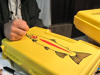 You can watch me do my artwork.  In fact, you can buy a fly box at the show and I’ll draw up any fish you want.  Or bring your own fly box, computer, backpack or you name it from home and I’ll do that.  My show time is limited so it never hurts to let me know in advance your requests or needs – Contact Jeff.