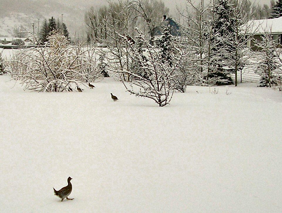 Today’s photo is my backyard full of sharptail grouse. They show up during the first winter storm every year and demolish all my crab apples. Fun to watch but they better be careful, I like a little upland bird hunting now and then!