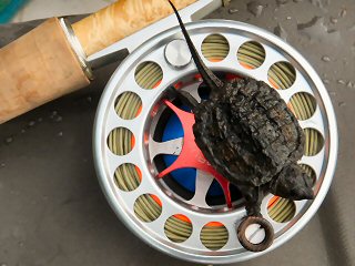 We caught one other fun critter. Early in the morning I snuck up on what I expected to be a musk turtle. I thought I saw a protruding head the correct size. It turns out I saw the entire turtle – a quarter size snapping turtle. I grabbed him and we had our turtle for the day. I caught one this size when I was about 8 years old and had him as a pet for 24 years!