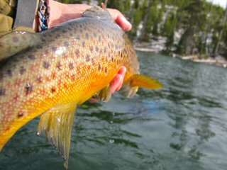 When we got into the channel itself fishing got even better. Yes that means we caught more than three fish every five minutes! It was truly unreal. One thing I noticed is that the browns are larger than the norm for Lewis Lake. By and large these guys average about 16” but today I’ll bet most were 17” to 19”. My best fall flies up on Lewis are rubber leg type flies in yellow. I caught a few lakers on this fly today but black was even better. In fact the only fish I caught on the yellow yummy were lake trout.
