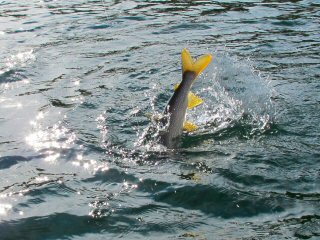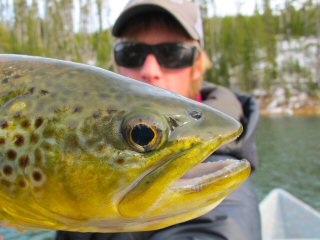 When we got into the channel itself fishing got even better. Yes that means we caught more than three fish every five minutes! It was truly unreal. One thing I noticed is that the browns are larger than the norm for Lewis Lake. By and large these guys average about 16” but today I’ll bet most were 17” to 19”. My best fall flies up on Lewis are rubber leg type flies in yellow. I caught a few lakers on this fly today but black was even better. In fact the only fish I caught on the yellow yummy were lake trout.