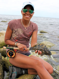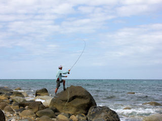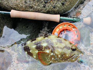 Bringing the footwear for dancing on slippery rocks has paid off. Today I made Granny saddle up and fish from the rocks as well. We tossed my 9-weight Jungle Winston with a Sea Habit fly, one of my old standbys for saltwater.