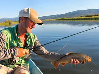 This is a technical dry fly location and is best fished in waders.  But the water is still so high it’s hard to wade.  Though a challenging launch, we took the boat.  From 5 to 7 PM things looked grim for fishing.  The hatch hadn’t started.  We kicked back with some snacks and a few ice cold beers.  The sun was scorching hot but we relished every second.