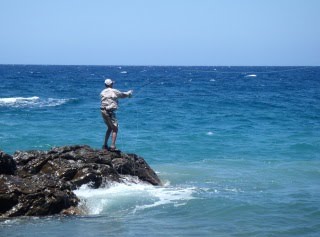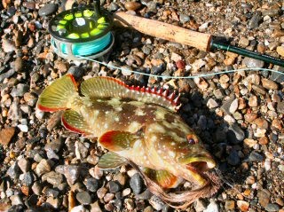 I went on to catch another flag cabrilla, a mystery cabrilla that was one of the prettiest creatures in nature and had a boil behind my fly that was so big it scared me. I kept thinking I was ready to rejoin Sammy and Grant but the tide was dropping and I could wader further out and cast to new appearing rocks. Then it happened. The howling wind grabbed a cast of mine and took it way out there. I made two strips and I got ripped. I knew immediately that it was what I was after, a big snapper or a grouper because in five seconds, even with the drag of my Ross reel cranked the fish screamed off all fly line, about thirty feet of backing and stuck me in the rocks. Dang! I casted my butt off for the two hours just to jammed up in the rocks in five seconds.