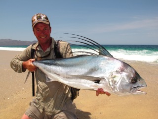 I’ve been coming to Baja for almost twenty years now. I love to catch all kinds of cool fish, but the main target is generally roosterfish. I take roosterfishing a step further and go for my roosters off the beach – sight casting only. It took me eleven days to catch my first quality rooster off the beach back in 1996. When I say quality, at that time quality was a rooster over 15lbs.