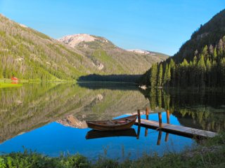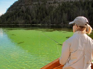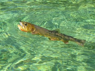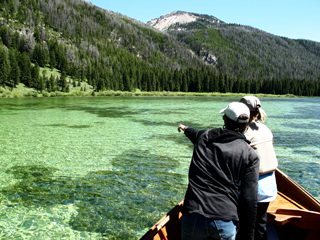 After lunch, Trey and I took one of the students, Sue, on the lake. Unlike yesterdays “weather horror show”, today was crisp and clear with just a light wind, absolutely perfect for lake fishing. The Ranch boat is a classic AJ DeRosa Wooden boat. This hand crafted boat may not be the best idea for a raging bouldery river, but for Flat Lake it’s superb and extremely classy might I add. Trey rowed us to an area he refers to as bonefish flats for cutthroats. He was right. As soon as we got there I couldn’t believe how much the bottom looked like the sand of a saltwater flat and how the weeds looked like turtle grass. Then there were the torpedo sized cutthroats hunting over the sandy patches – man did I want to make a cast. But this was school, and Trey got Sue rigged up with a floating line and a long leader. And rather than a Crazy Charlie, Trey tied her on a nice looking black nymph.