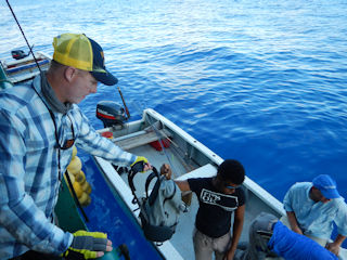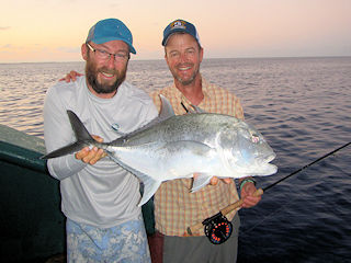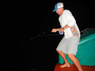 The nice thing about a slow fishing day when your living off the Maya’s Dugong is that when the guides are done fishing doesn’t mean you’re done.  After dinner, we dredged heavy flies on sinking lines from the back of the boat.  All kinds of havoc took place with bigeye trevally and baby dogtooth tuna being most of the action.  But there were several fish we lost before seeing.  Here I am struggling to hang on to one of the escapes.