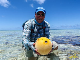 The day result for my group as a whole was fair at best.  There were no GT’s caught which is unusual.  In fact, few were seen.  But there were lots of nice bonefish caught and the folks had their opportunities for bumpies and triggerfish.  The most unique catch of the day was this golden puffer fish by Lance.  They basically spooked the funny fish and he inflated.  He refused to deflate in their presence so they photographed him for fun.  Yes, this picture is real!