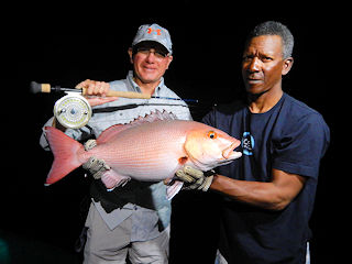 One of the best catches was Sammy and this bohar (two spot red snapper).  These snappers grab a fly with a burst of speed back to bottom that until you experience it can’t be explained.  This beast should not have been landed because he got Sam stuck on bottom.  However, guide Peter saved the day and slowly pressured the toothy fish from the rocks 80feet below the boat.