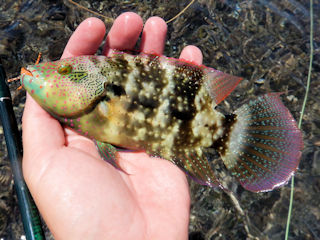 Most the tailing fish I saw were emperors.  I cast to a few triggers but they were ridiculously spooky and never flinched for my fly.  I picked up a few random fish including a species of wrasse that none of us can identify tonight even with the fish book.  He’s colorful and although most of us thought it to be an immature Napoleon wrasse, Matt saw a much larger of these recently.  If anyone can help here please shoot me a note.  I would greatly appreciate getting this species correct on my list.