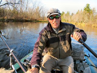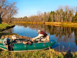Once I was up and after a great breakfast (seriously, we eat on this trip) I soon found myself casting from the bow of Bill Sherer’s pontoon boat on one of the most gorgeous rivers you have ever seen. Certainly, I moved to the Yellowstone area because I love the mountains and all that goes with it, but I can promise you, Northern Wisconsin is beautiful. Even though the leaves have left most of the trees the scenery is stunning. The dense forest ground is covered in colored leaves and the birch trees are glowing white. To top it off, the tamarack trees, a deciduous coniferous tree that to me is the symbol of being far north, are vibrant shades of yellow. Beyond the tree line was rich blue sky in every direction, a big change from last nights dreary drizzly cloud cover. Even the cold front the area has been experiencing moved out. Today reached a comfortable 50°.