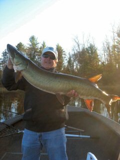 Rick and John had about the same luck as Bill and I. They did not catch a thing. Not only that, they never saw a musky. Today was flat out tough. The rest of the gang did better but for most, not much. Even with muskie lures and live bait their fishing was difficult too. However, in this group there’s always an exception. Larry who was fishing with James caught and released two muskies that fell for a live sucker. One was this inspiring 44 incher!