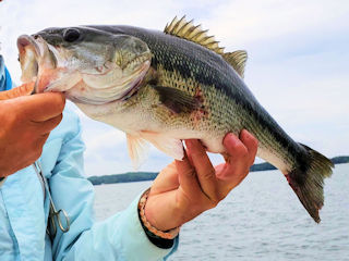 Lake Lanier is famous for striped bass fishing but the stripers are deep this time of year so our target was spotted bass. To the average angler spotted bass look like largemouth bass but they’re actually a different species. They have smaller mouths and are also recognized by a tooth patch you can feel on the tongue that largemouth don’t have.