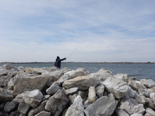 Branched Oak is the largest of the Salt Valley Lakes. We parked at the recreation area and headed out on a rock jetty. I rigged my 5-weight with a heavy black Clouser minnow at the point and a lighter weight chartreus and white Clouser as my dropper on straight 0X Flouro. The weather was nice when we arrived but before we made our first cast the wind kicked up.