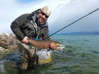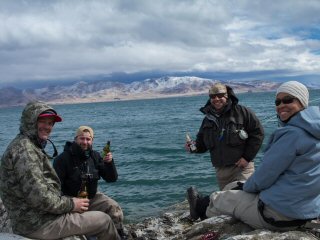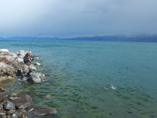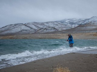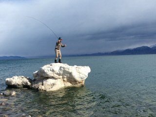 Last night was an early night and we were back to Pyramid Lake before 9 AM. We’d likely arrived earlier but today’s forecast was for cold, rain, snow and ferociously high 30 mph wind with gust to 50 mph. I was actually looking forward to the chaotic weather and the opportunity to use my heaps of Simms but it wasn’t so bad early on. We split into two groups and Granny and I went with about ten guys to Spider Point. I found a nice rock to cast from instead of the ladder today.