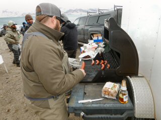 The other group fished where I fished last night. They did well and landed a nice fish like Jon’s. But in two and half days there were no fish over 10lbs which Darin and the guides say is unusual when 25 dudes are fishing. It didn’t matter. Erick Johnson of Scientific Anglers grilled up a heap of delicious brats that were to die for.