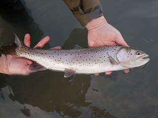 Wind and waves are always good for fish. I skipped the ladder and waded out to my waist and began back casting in order to get my fly out into the wind. On about my tenth cast I hooked up. It was another ripper but after I put the heat on with my 0X I landed my one and only fish of the day.