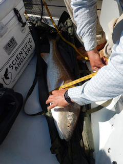 This size of this redfish far surpassed my wildest expectations. The 21lber the first day was a thrill but this fish blew my mind. Cleve pulled out a big fish cradle I’ve seen used for big pike and musky. We carefully placed the redfish in the bag where Cleve measured the girth and length. Our redfish was 42” long with a beastly girth of 21”. This red was over 30lbs!