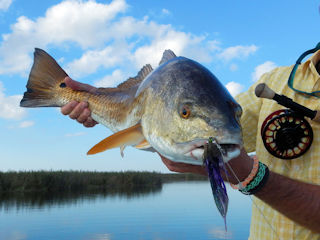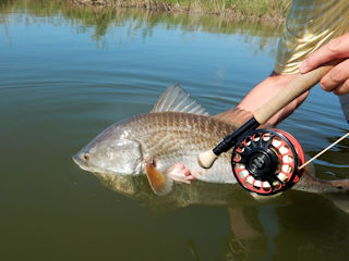 For once it was us we humans who did the outsmarting. After a few minutes of “walking the dog” the jumbo redfish was out in the open marsh. Then I put the red on the reel and cranked down my drag. That woke her up but it was too late. I used my Winston Jungle 9-weight to finish her off and Cleve made a fine scoop with the net.