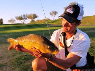 We could have caught a few more small commons here but John took us to another lake where a rumor exists about a carp so big it scares golfers. It was near dark when we arrived and all we could see were a few moving blades of grass along the bank. I spooked the first two fish I cast at but then caught this handsome common carp on a rubber leg hares ear nymph. Not exactly big enough to scare you but a good looking carp nonetheless.