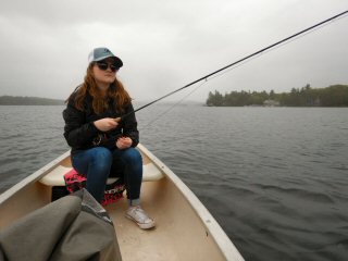 Granny and I had no interest in having kids but we like borrowing. For years I’ve been taking my nieces fishing. They’ve made annual appearances on the blog and it’s been cool watching them grow up. This year the oldest, Sammy, is 15 and soon to become 16. My brother arrived at camp here in Wolfeboro, NH last night with Sammy for the Memorial Weekend and tonight I took her fishing. I’m not sure she was 100% on board for this Uncle Jeff adventure in the drizzle and cold!