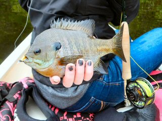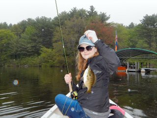 But Sammy was a sport. She and I paddled to Back Bay and rousted up a few nice sunfish. They were far and few between with the cold temps but twitching a small size Chernobyl ant still put a move on a few of them.